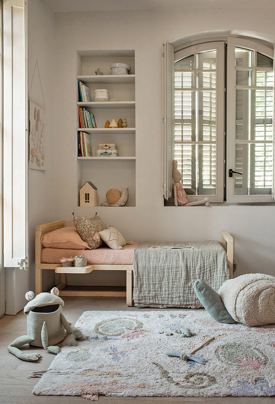 A magical pond overflowing with charming water lilies, buzzing dragonflies, bouncy frogs, and lazy snails enters the children's room with a decor collection inspired by the secret life of these fascinating lagoons.