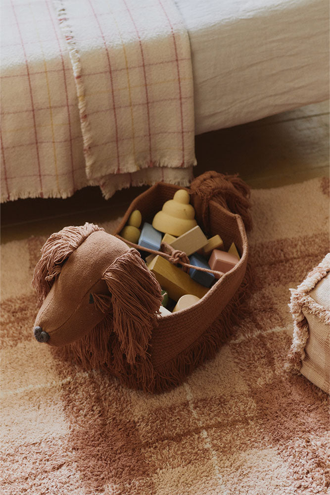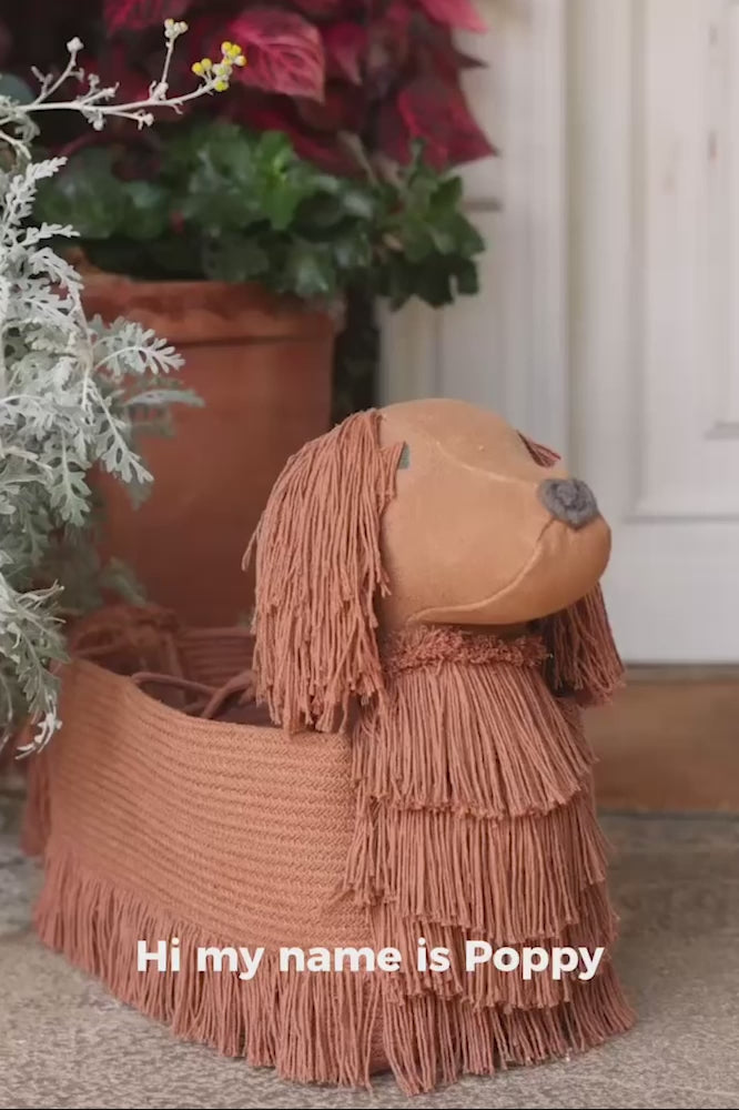 Lerne Poppy und ihren flauschigen Schwanz kennen! Dieser handgefertigte Korb ist inspiriert von der Silhouette eines Setters. Entdecke Poppys liebevolle Details: Fransenlagen an den Ohren und am Schwanz sowie gestickte Wimpern. Ein Seil entlang der Seiten hilft, die Form zu bewahren, und ein kleiner Spielzeugknochen am Etikett sorgt für einen verspielten Abschluss.