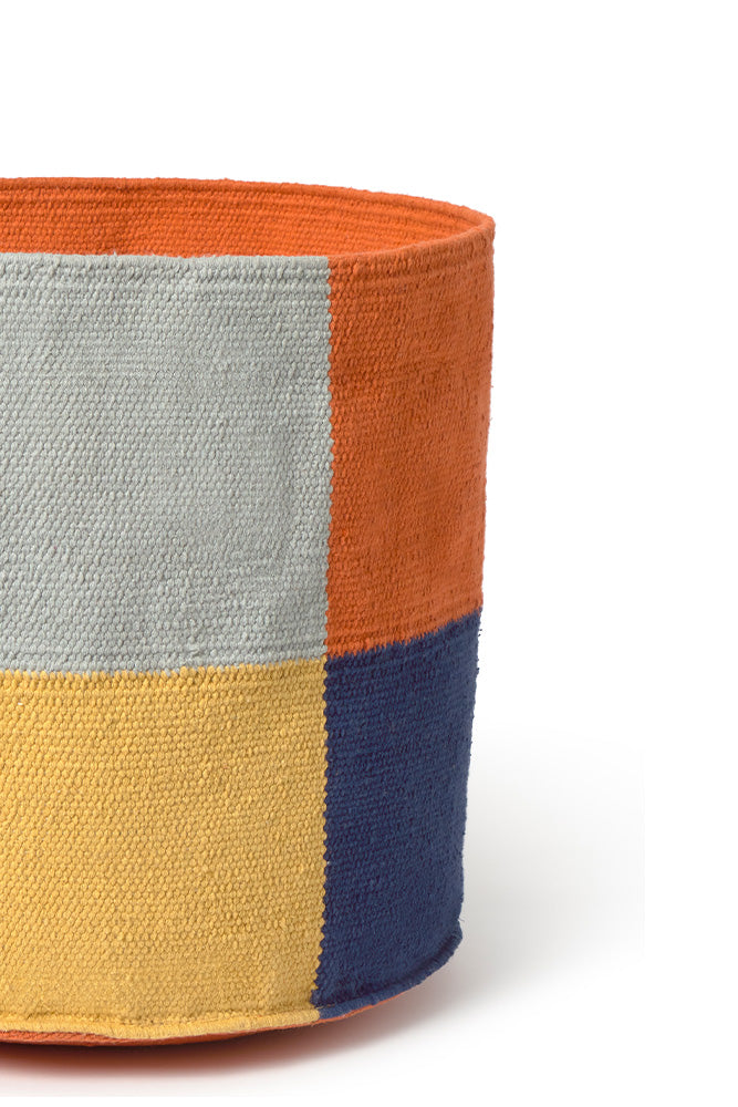 Inspirada en la Bauhaus, esta cesta kilim tejida a mano es perfecta para almacenar con estilo. Combina diseño atemporal, textura y patrones divertidos. Ideal para juguetes infantiles, rincones o para el salón.