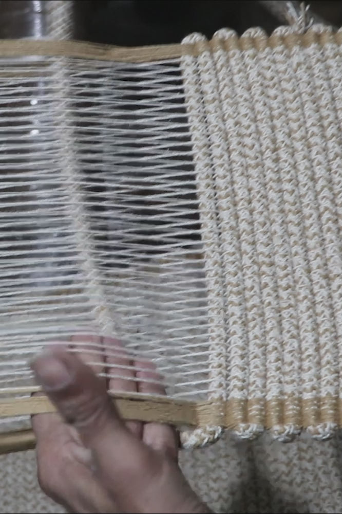 La combinaison de fils aux tons ocre et naturel crée une finition texturée et riche en profondeur, avec une esthétique contemporaine et unique. Inspiré de « With Verticals » d’Anni Albers, il se distingue par son procédé de fabrication artisanale rare.