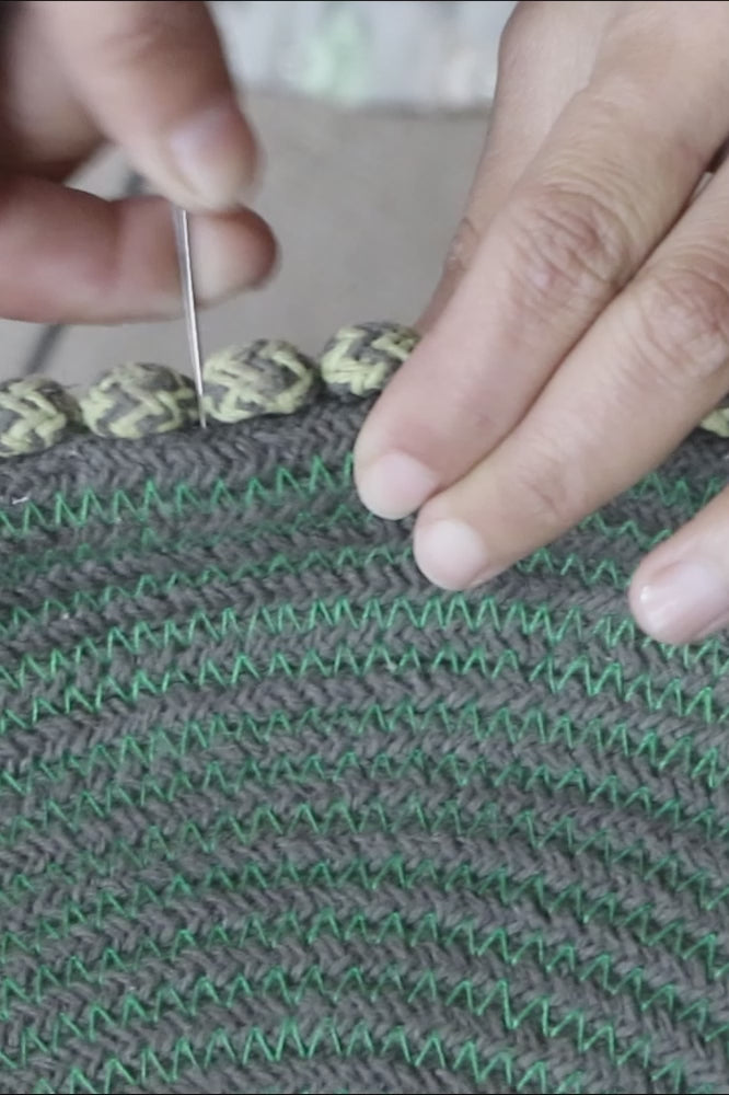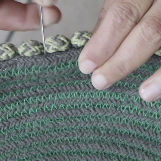 Panier tissé en corde de coton, fabriqué selon une technique artisanale d’enroulement où le fil entoure la corde pour créer des lignes verticales structurelles qui apportent de la rigidité au design.